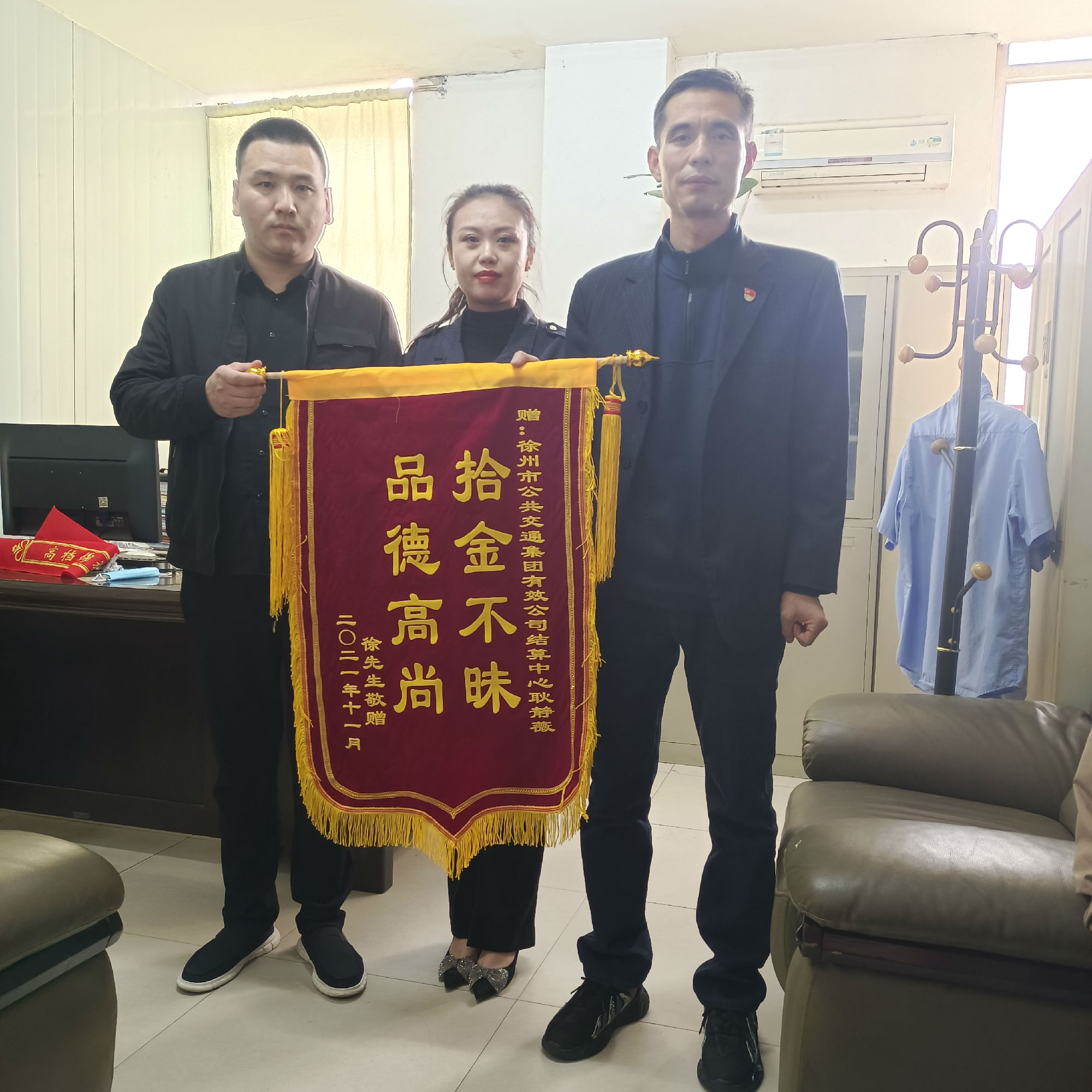 原來(lái)11月2日早上,結(jié)算中心職工耿靜薇在上班途中,經(jīng)過(guò)夾河街路口時(shí),無(wú)意中發(fā)現(xiàn)一個(gè)黑色手包,等待許久未見(jiàn)失主前來(lái)尋找,便將手包帶到了公司。經(jīng)檢查,包內(nèi)有銀行卡,手機(jī)及部分現(xiàn)金,但未找到任何聯(lián)系方式,這時(shí)失主的手機(jī)鈴聲響起,傳來(lái)了失主焦急的聲音。不一會(huì)兒,失主徐先生趕到結(jié)算中心,領(lǐng)回了物品。次日,徐先生特意送來(lái)錦旗,并表示衷心的感謝!