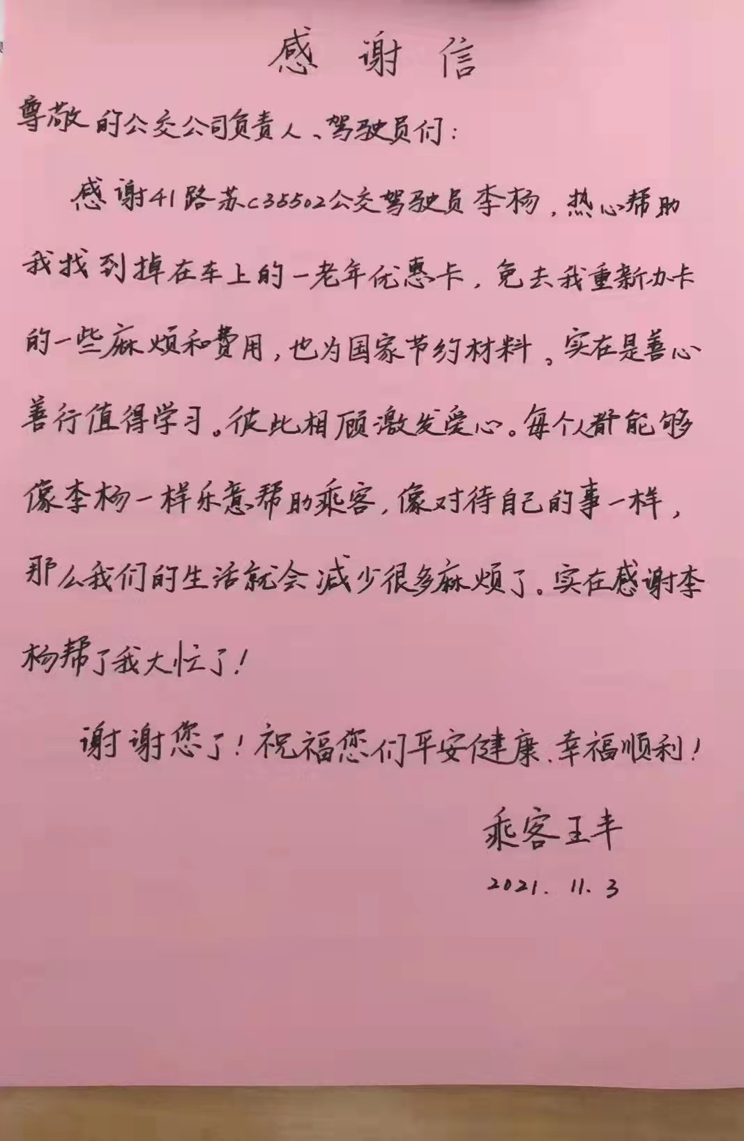 新區(qū)公司駕駛員李楊駕駛41路蘇C35502號(hào)車(chē),行駛至銀湖小區(qū)站臺(tái)時(shí),乘客王女士向其求助。王女士告訴駕駛員,早晨10點(diǎn)20分左右,她乘坐41路公交車(chē)時(shí),不慎將老年優(yōu)惠卡丟在了車(chē)上,希望李楊幫她尋找一下。李楊留下了王女士的電話,待車(chē)輛到達(dá)建筑學(xué)院后,李楊立即去調(diào)度室尋找,根據(jù)王女士提供的乘車(chē)時(shí)間很快鎖定了車(chē)輛,經(jīng)詢問(wèn),王女士的老年優(yōu)惠卡已被駕駛員交到了調(diào)度室妥善保管。11月3日下午,王女士取回了失而復(fù)得的老年優(yōu)惠卡,并送來(lái)感謝信。
