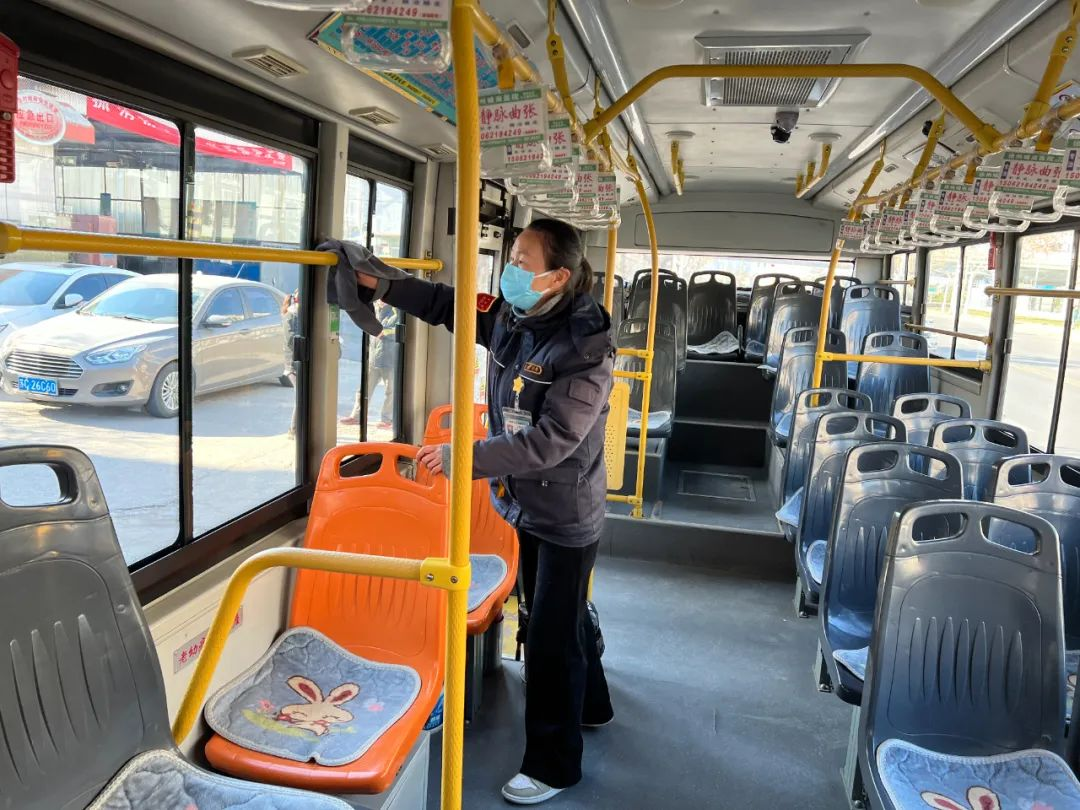 王海芬跑的這條線路,穿過數(shù)條主干道,經(jīng)過工人醫(yī)院、兒童醫(yī)院等一個個醫(yī)療中心。“這幾天有一位乘客,兒子剛動完手術(shù),他每天要到醫(yī)院送飯。每次上車,我們都會互相寒暄幾句,心里也暖暖的。”為了自己的健康也為了他人的健康,王海芬利用休停時間把座椅、扶手等地方用消毒液進行擦拭,每一趟的間隙開窗通風,保證車內(nèi)空氣流動,她在車內(nèi)配備了藥箱,里面有口罩等防疫物資以備乘客不時之需。