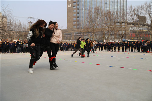 “參賽隊(duì)員各就各位!裁判員準(zhǔn)備計(jì)時(shí)!”運(yùn)動(dòng)會(huì)主持人一聲令下,首先開(kāi)始比拼的項(xiàng)目是需要隊(duì)員齊心協(xié)力,發(fā)揚(yáng)合作精神的“三人四足接力賽”,三人一組紅繩綁腿齊步走,每隊(duì)12名參賽隊(duì)員,比的是速度,更是勁兒往一處使的同心合力?!凹佑停〖佑桶?!”“一二!一二!”比賽場(chǎng)上運(yùn)動(dòng)員的號(hào)子聲和場(chǎng)外女工們的加油聲、歡笑聲交織一起,此起彼伏。