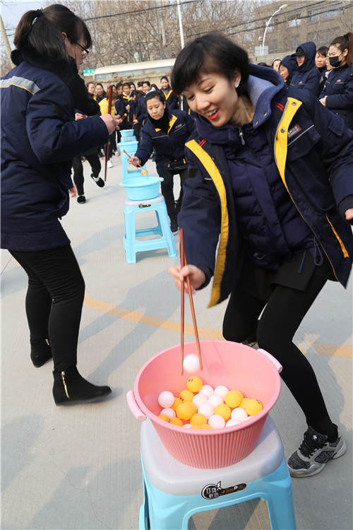 “穿針引線接力賽”和“夾乒乓球比賽”比較有意思,項(xiàng)目充分展現(xiàn)了女工們心思細(xì)膩的一面和嫻熟的家務(wù)活兒功底。手捏繡花針,穿針引線,筷子夾乒乓球,分明是練“炸丸子”嘛。參賽隊(duì)員情緒飽滿,勠力同心,密切配合,氣氛歡快熱烈而緊張,一場(chǎng)場(chǎng)精彩的比拼把運(yùn)動(dòng)會(huì)推向一個(gè)又一個(gè)高潮。尤其是最后一項(xiàng)“搶板凳比賽”,看誰(shuí)反應(yīng)快,比誰(shuí)會(huì)“搶”,快樂(lè)有趣,更是引來(lái)一次次加油喝彩,一波又一波歡聲笑語(yǔ)!