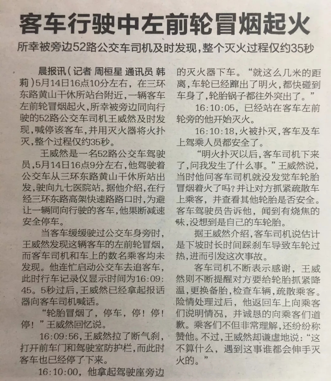 5月14日16點(diǎn)10分左右,在三環(huán)東路黃山干休所站臺(tái)附近,一輛客車左前輪冒煙起火,所幸被旁邊同向行駛的52路公交車司機(jī)王威然及時(shí)發(fā)現(xiàn),喊停該客車,并用滅火器將火撲滅,整個(gè)過(guò)程僅約35秒。
