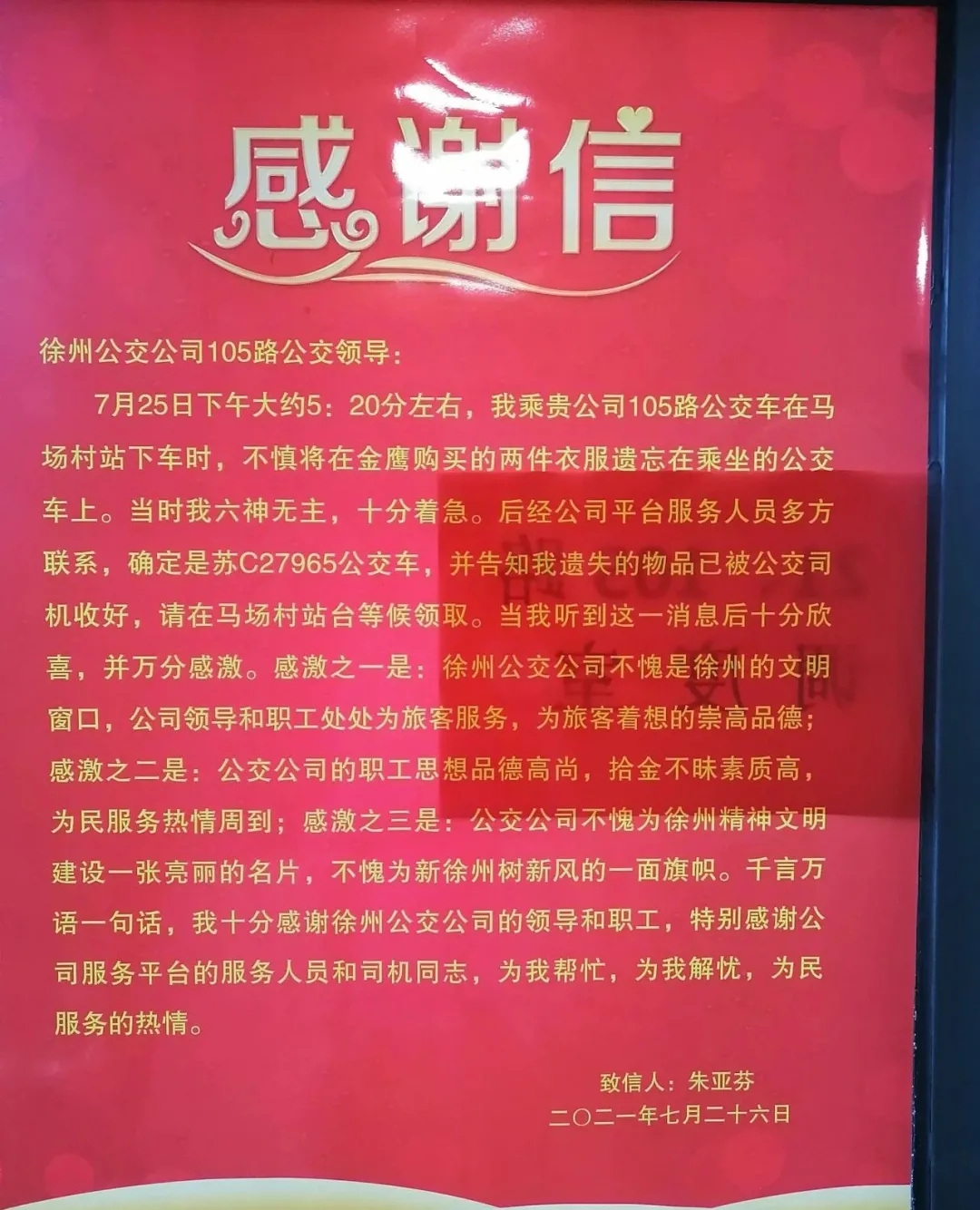 “我一時疏忽丟了東西,如果沒有袁丁師傅,我這兩套西服就不知所蹤了,真的非常感謝。”7月26日,乘客朱先生送來感謝信,對徐州公交的暖心服務(wù)表示贊許。