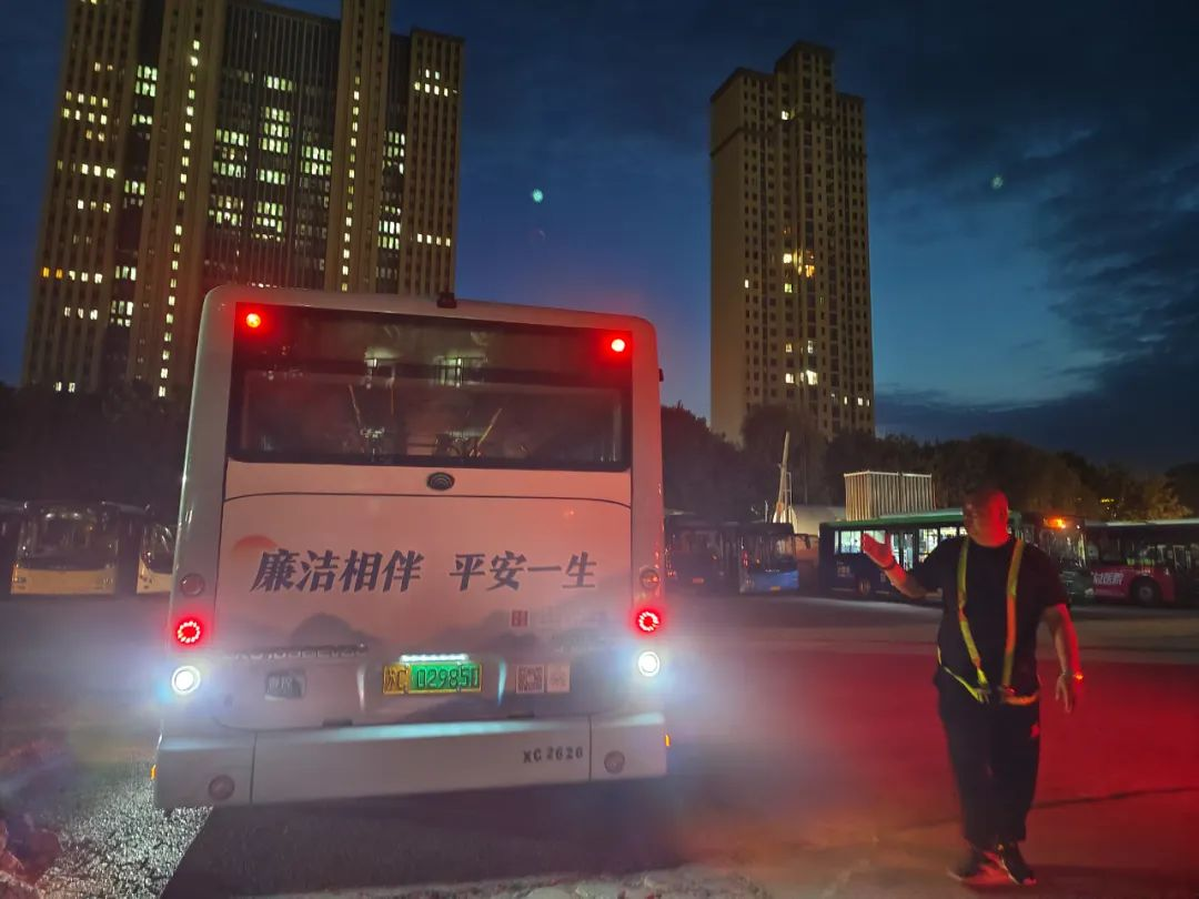 進入丑時,許多人都已進入夢鄉(xiāng),末班車回場,在萬籟俱靜的夜里,內(nèi)保員徐智指揮倒車,同時還要逐個檢查停車場內(nèi)的車輛擺放,匯報車輛歸場情況,確保車輛全部安全歸場。