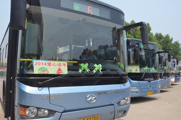 一年一度的高考是社會關(guān)注的熱點,每年這個時候,徐州的大街小巷都有這樣一個群體——送考愛心車隊。懸掛綠絲帶的送考車,成為城市道路上靚麗的風(fēng)景。今年,公司也加入到“愛心送考,算我一個”2014愛心送考公益活動中,在66路、76路、65路、11路、608路等5條途經(jīng)考點的線路成立“愛心公交”送考專線。高考期間,考生憑準(zhǔn)考證可免費乘坐這5條線路。為了給考生提供力所能及的幫助,駕駛員還在車上配備了方便袋、清涼油、創(chuàng)可貼等用品,以備乘客不時之需。圖為“愛心送考”啟動儀式現(xiàn)場。